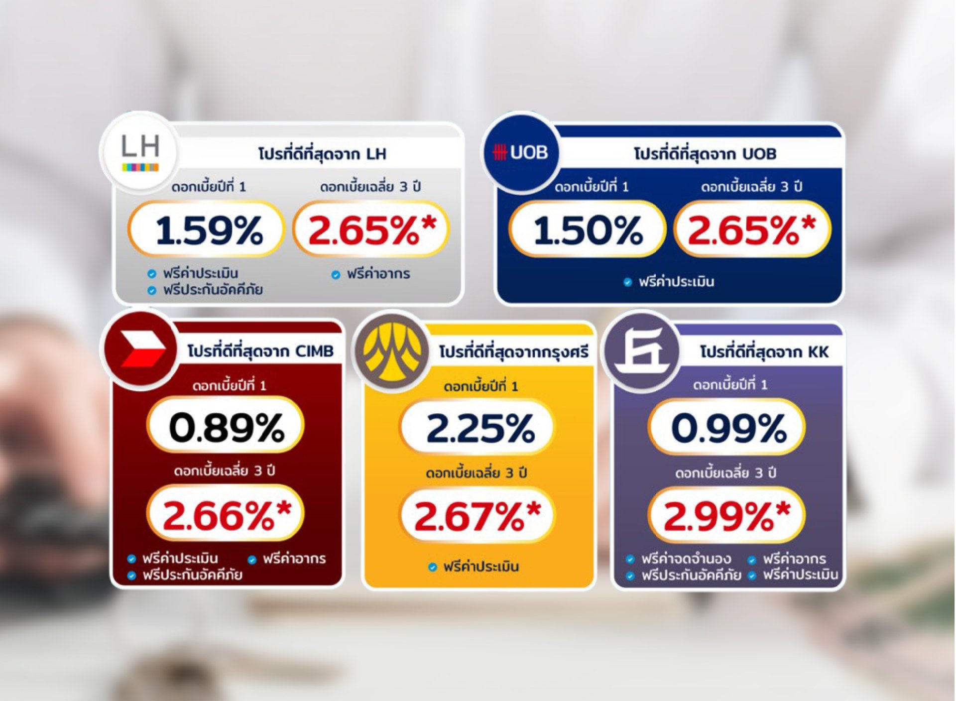 - ดอกเบี้ยเฉลี่ย 3 ปี เริ่มต้นเพียง 2.65% 2.99% (ขึ้นอยู่กับเงื่อนไขแต่ละธนาคาร)